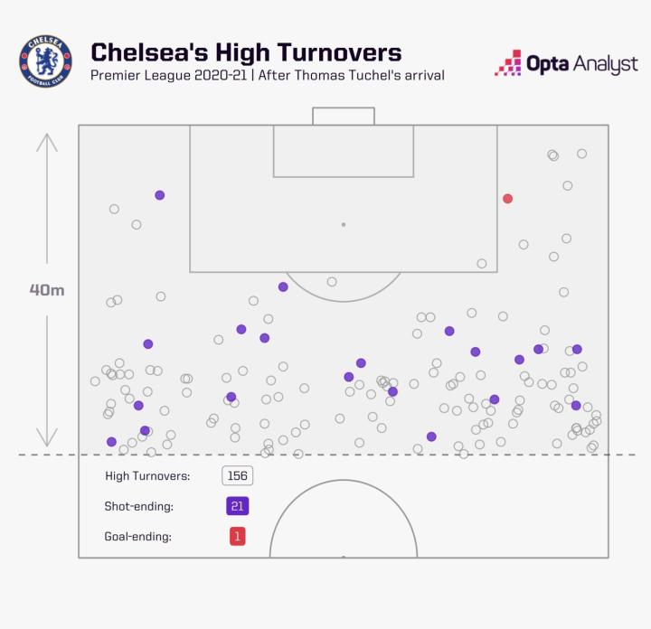 经过初期的适应期后,图赫尔执教的切尔西在2020-21赛季的最后14场联赛中,有一半比赛至少完成了10次高位抢断,而在前24场中仅有三次达到这一水平,这一切都表明,图赫尔过去能够在战术上迅速产生影响。