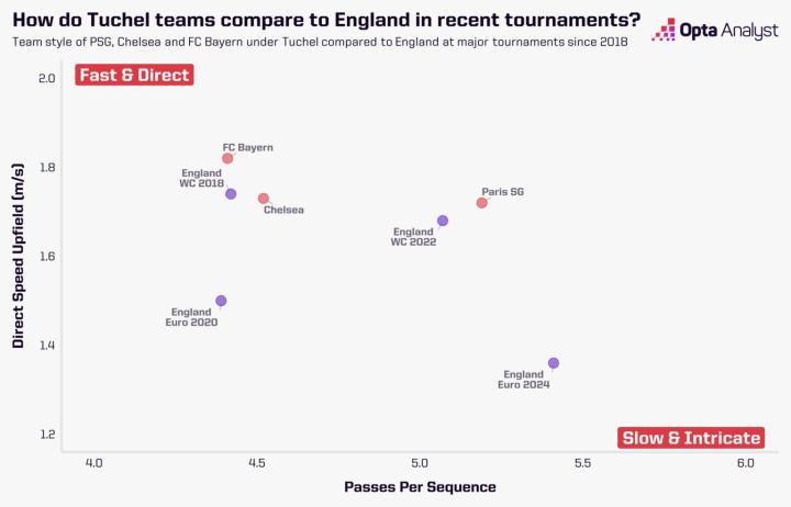 下图简要地证明,图赫尔的球队通常比英格兰队在2024年欧洲杯时的表现更为迅速,许多人会认为这是一个好现象。
