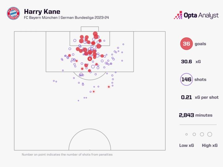 无论是由于图赫尔的指示,还是相信自己的俱乐部队友在没有他回撤的情况下也能创造足够的机会,凯恩在拜仁都是更多地待在禁区内及其周围,这可能是他在德国进球效率更高的秘密。