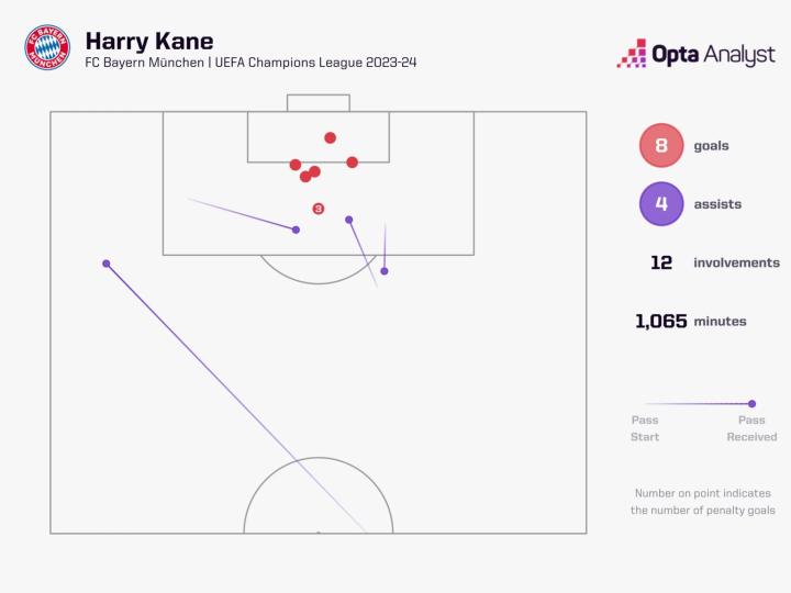 他在拜仁晋级欧冠半决赛的过程中直接参与了12个进球(8个进球,4次助攻),这是英格兰球员在单赛季欧冠中参与进球最多的一次。