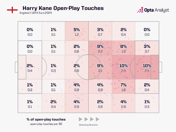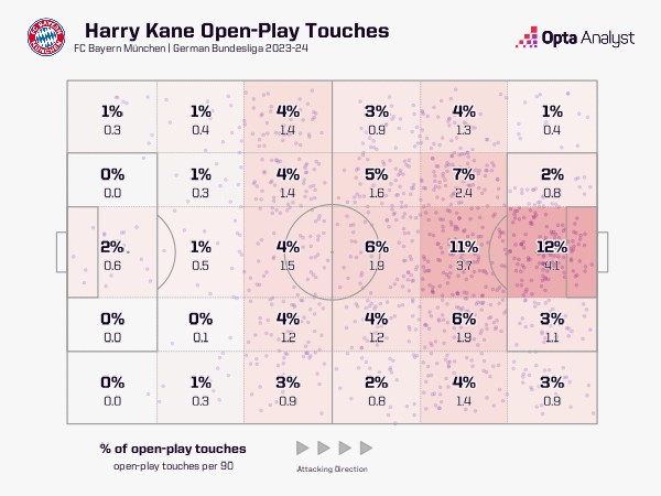 从他的触球区域图中可以看出,在图赫尔执教下,凯恩在德甲39%的运动战触球发生在中场三区,而在2024年欧洲杯上为英格兰效力时这一比例为44%;在拜仁,他23%的运动战触球发生在进攻三区的中部区域,而在欧洲杯上这一比例为20%。