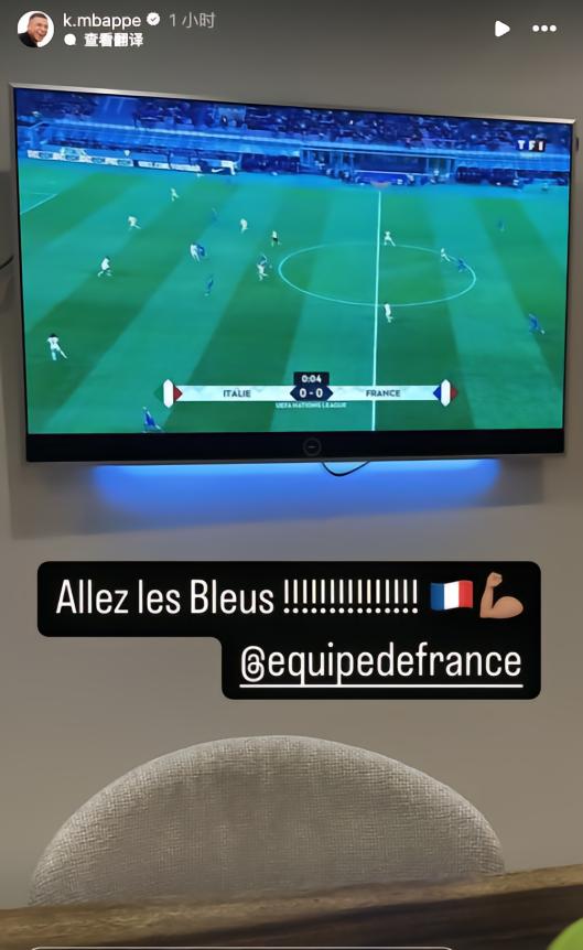 欧国联A级联赛第6轮,法国队客场对阵意大利队,缺席本次国家队集训的法国队长姆巴佩在社交媒体晒出他在电视机前支持球队的照片。