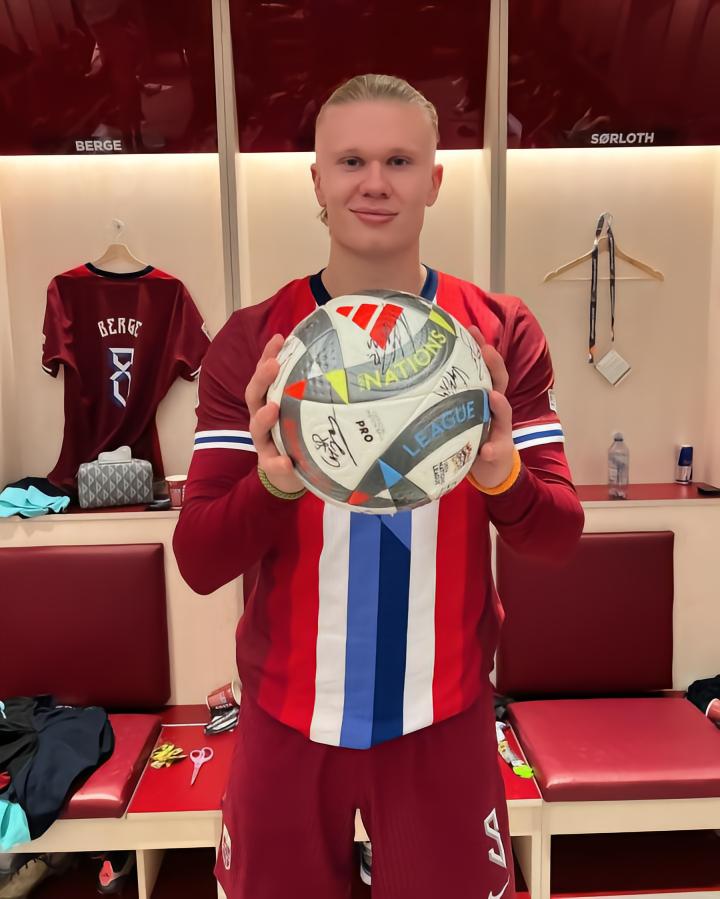 此役上演帽子戏法的哈兰德按照惯例将比赛用球带走收藏。赛后,哈兰德在社交媒体晒出他抱着比赛用球的照片,并配文:“为了挪威!🇳🇴”