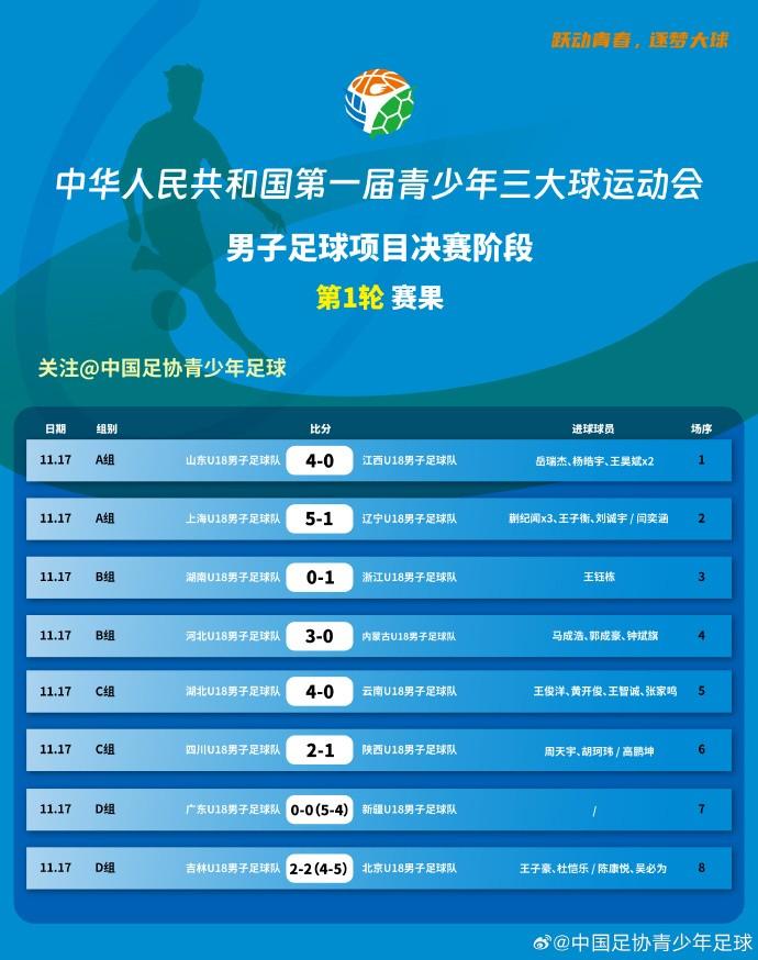 中华人民共和国第一届青少年三大球运动会男子足球项目决赛阶段第1轮战况:A组山东男足、上海男足取胜,B组浙江男足、河北男足取胜,C组湖北男足、四川男足取胜,D组广东男足、北京男足取胜。