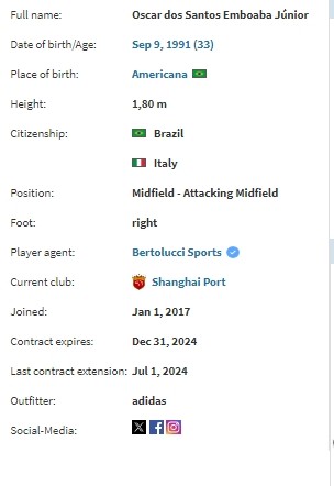 奥斯卡的合同12月1日到期(注:德转网站资料里显示是12月31日到期),在外界看来,11月23日的足协杯决赛很可能就是海港队长在球队“最后演出”。