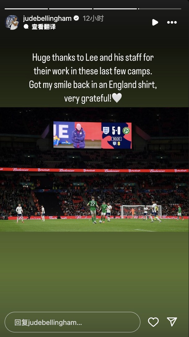 贝林厄姆晒出了卡斯利在赛场大屏幕上的照片,并写道:“非常感谢卡斯利和他的团队在过去几次集训期间的付出!身穿英格兰队球衣,我找回了自己的笑容,非常感激!”