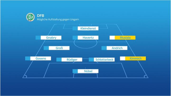 德国天空体育记者普勒滕贝格预测了德国队对阵匈牙利队的首发阵容,基米希和穆西亚拉可能轮休。