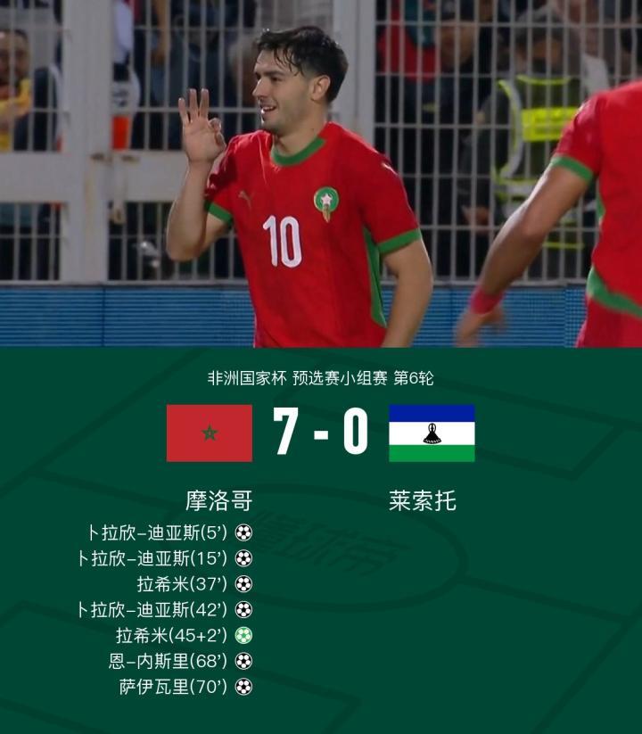 摩洛哥7-0莱索托,卜拉欣职业生涯首次戴帽,拉希米2射1传