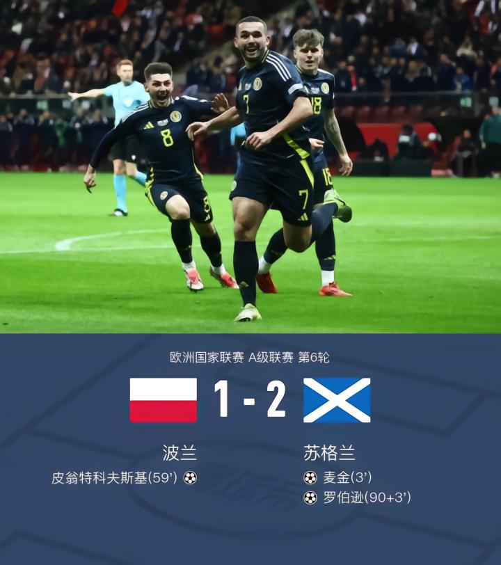 波兰1-2苏格兰降入B级联赛,麦金破门,罗伯逊补时头球绝杀