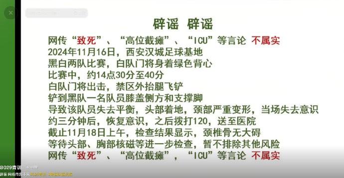 11月17日,网传陕西西安一足球训练基地比赛时发生意外,一名球员被对手飞铲从半空摔倒在地,不省人事后送医不治。《都市现场》报道,事发其中一方球队队长辟谣:“受伤球员检查结果显示颈椎骨无大碍,网传‘致死’、‘高位截瘫’和‘进ICU’言论为虚。”