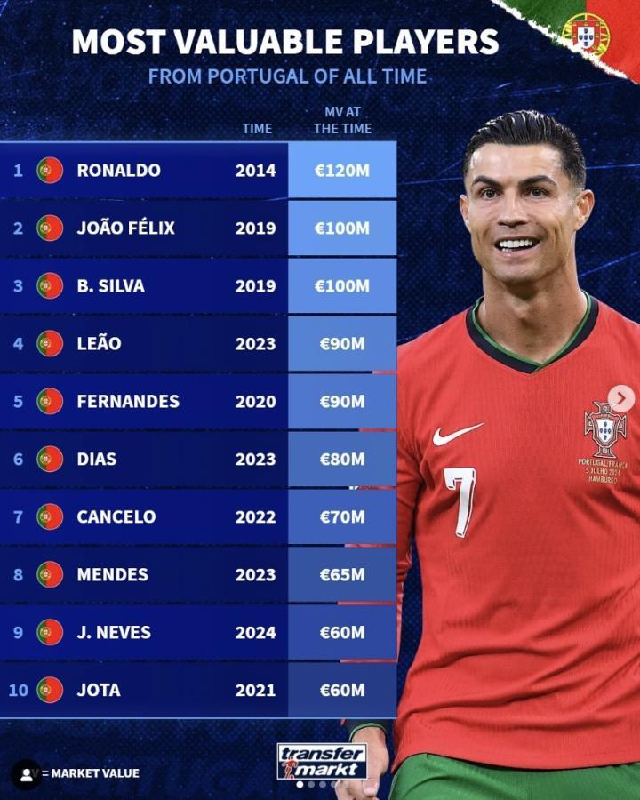 北京时间11月19日,德国转会市场列出了葡萄牙球员德转历史身价排行榜。其中,C罗1.2亿欧居首,菲利克斯、B席1亿欧并列第二。