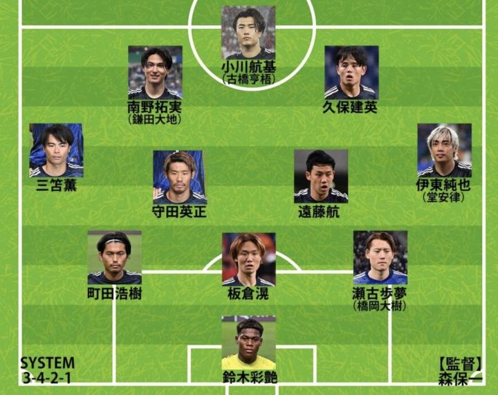 前锋:南野拓实(镰田大地)、久保建英、小川航基(古桥亨梧)