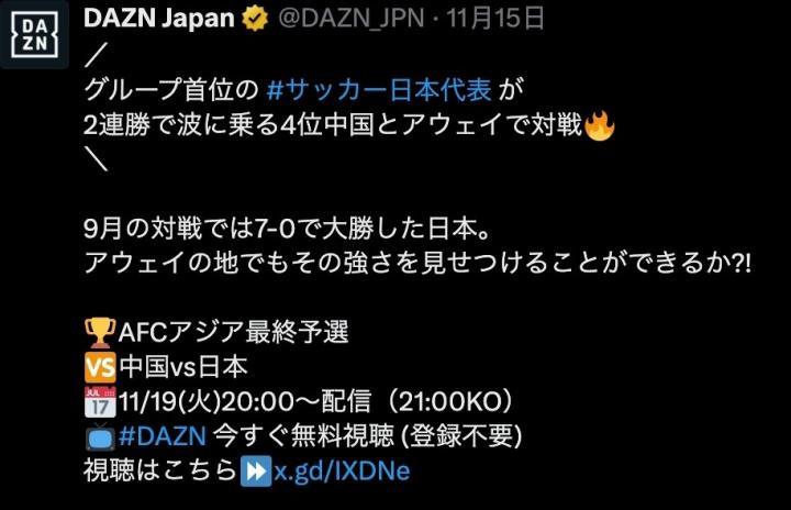 据《进球网》北京时间11月19日的报道,日本国内,本场日本客战国足的比赛将由创立于英国的体育流媒体平台DAZN独家直播,而该平台官方已发帖称本场比赛可以免费收看。