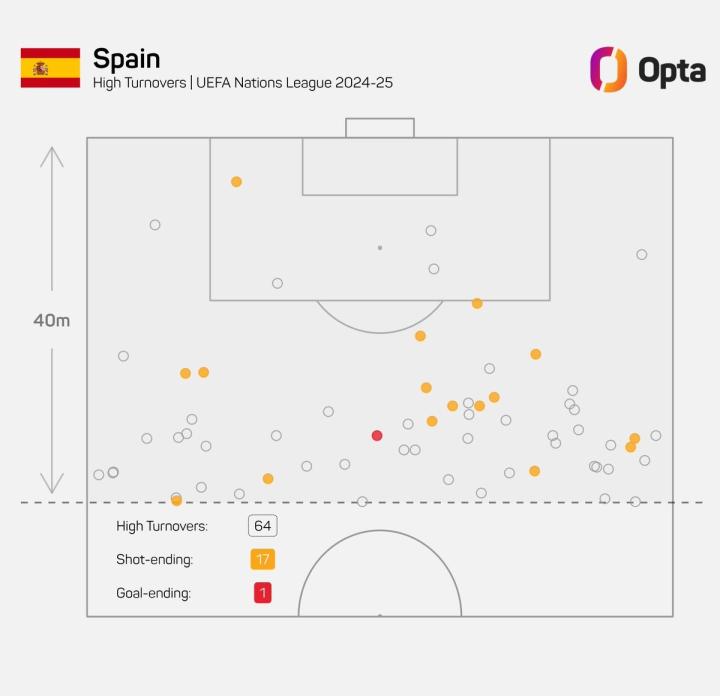 据统计,西班牙队本赛季欧国联一共完成了64次高位(对方禁区40米内)抢断,在高位抢断后形成了17次射门尝试,最终打入1球。