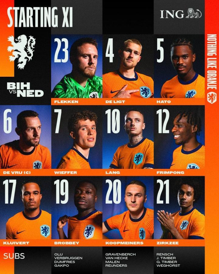 欧国联A级联赛第6轮,荷兰队客场对阵波黑队,荷兰队对首发阵容进行了11处调整。