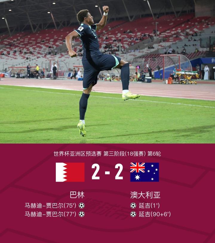 闪击+绝平!澳大利亚客场2-2巴林,贾巴尔、延吉各自双响