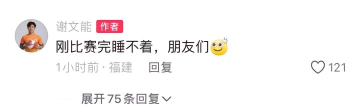 谢文能发布这条动态的时间是凌晨3点多,他还在评论区里补充了一句:“刚比赛完睡不着,朋友们。”