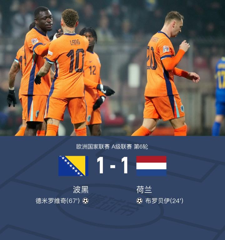 荷兰客场1-1波黑,布罗贝伊头球破门,德米罗维奇扳平比分
