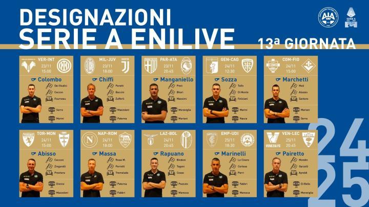 意大利的裁判协会公布了意甲第13轮各场比赛的裁判员名单,焦点战AC米兰主场对阵尤文图斯以及那不勒斯主场对阵罗马分别由齐菲和马萨吹罚。