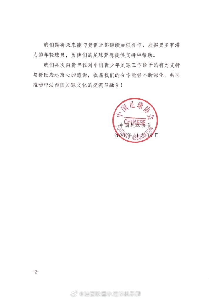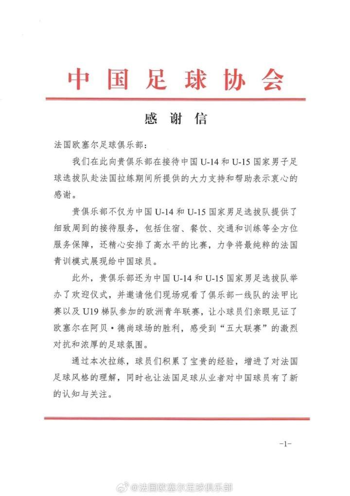 北京时间11月20日,法国欧塞尔俱乐部发文表示,他们收到了来自中国足协的感谢信。