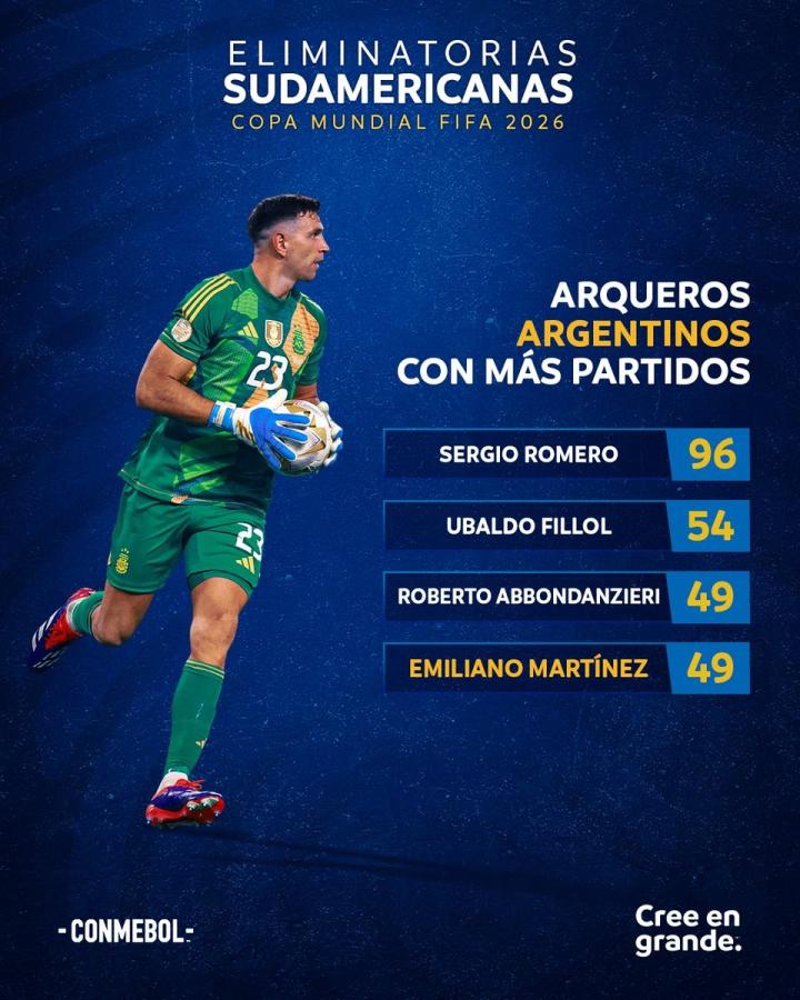 在与秘鲁的世预赛中,首发出战的达米安-马丁内斯以49场追平阿邦丹谢里,成为阿根廷队史出场次数第三多的门将,仅次于罗梅罗(96场)和菲略尔(58场。注:阿根廷足协官方统计为58场,南美足联统计为54场)。