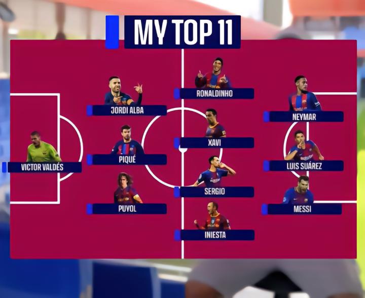 巴萨前锋拉菲尼亚评选出了自己心目中的巴萨队史传奇最佳11人,梅西、苏亚雷斯、内马尔领衔,哈维、布斯克茨、伊涅斯塔和罗纳尔迪尼奥在列。