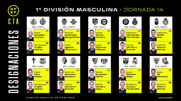 西甲官方公布了联赛第14轮的主裁判和VAR名单,领头羊巴塞罗那客场与塞尔塔的比赛由索托-格拉多吹罚,皇家马德里客战莱加内斯的比赛主裁为哈维尔-阿尔韦罗拉,马德里竞技主场与阿拉维斯的则由维克托-加西亚担任主裁。