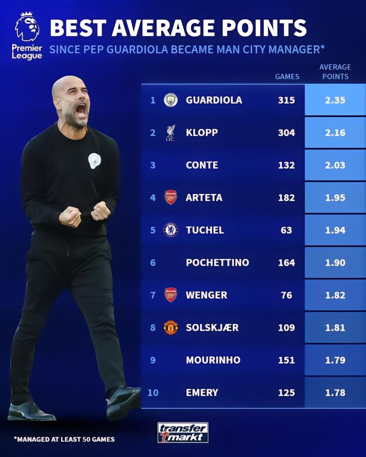 转会市场网统计了自2016年7月瓜迪奥拉接手曼城帅位以来英超主帅的场均积分排行榜,而瓜迪奥拉正是领跑这一排行榜的主教练。