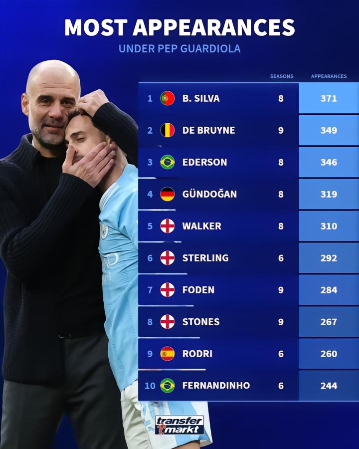 这份合同也将使瓜迪奥拉执教曼城的时间超过10年,转会市场网统计了由他执教过的球员的出场次数排行榜,其中伯纳多-席尔瓦位居榜首。