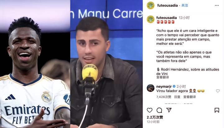 最近,曼城中场罗德里在塞尔电台的节目中谈到了维尼修斯。为此,内马尔进行了回应。