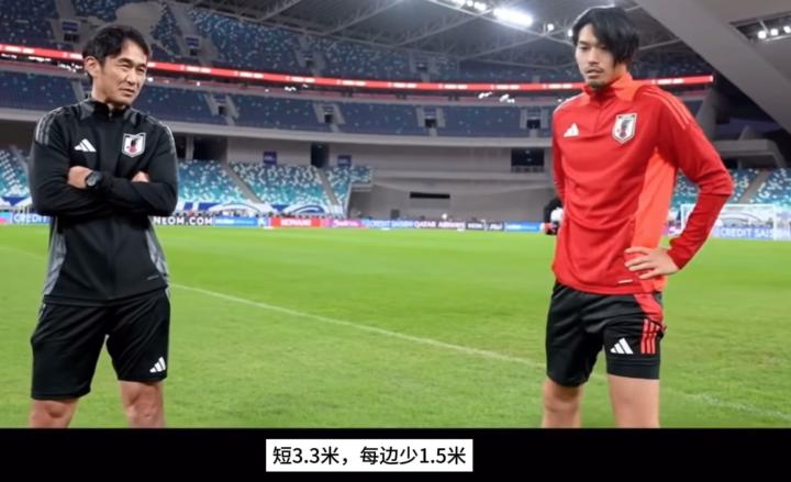 从视频中我们可以看到,日本队在白鹭体育场进行赛前训练时就已经注意到了球场边线的变化。日本队后卫町田浩树更是专门用脚测量了边线缩短的距离,并表示,“缩短了大概1.5m,两边就是3.3m”。