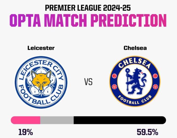 切尔西是赢球热门,Opta的超级计算机在赛前进行10000次模拟,蓝军赢球概率达到59.5%,莱斯特城赢球可能性仅有19%,而平局的概率为21.6%。