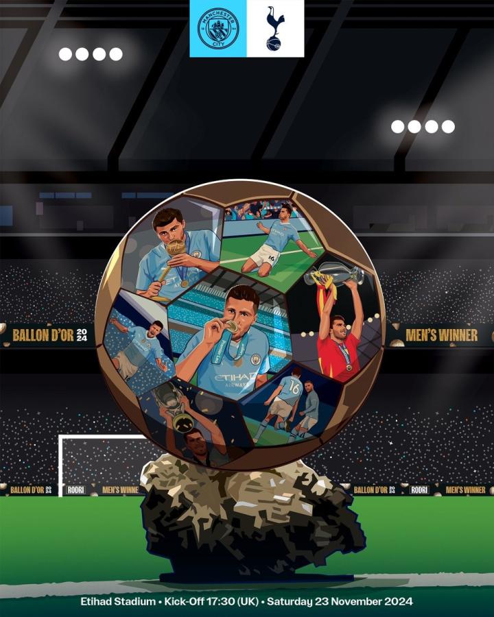 北京时间11月24日凌晨1点30分,英超第12轮焦点大战,曼城将在主场迎战热刺。赛前,曼城官方发布了本场比赛的赛前海报。