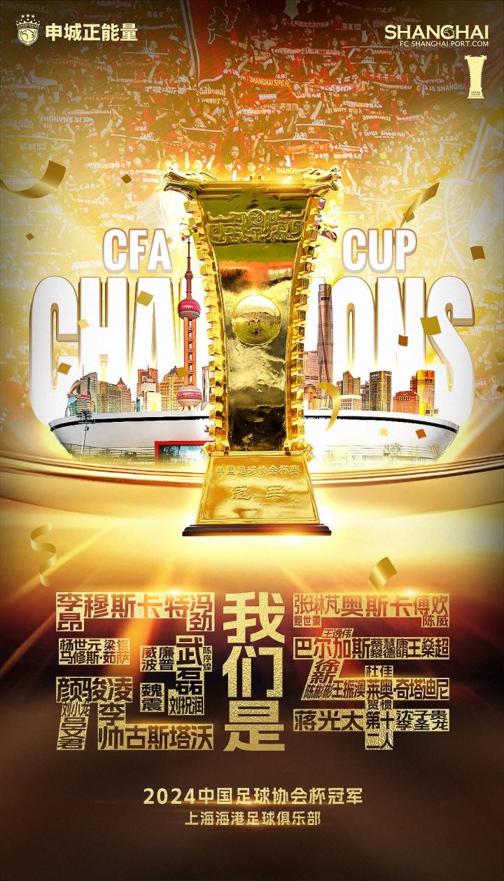 2024年中国足协杯决赛,上海海港3-1击败山东泰山,队史首夺足协杯冠军,上海海港官方发布夺冠海报。