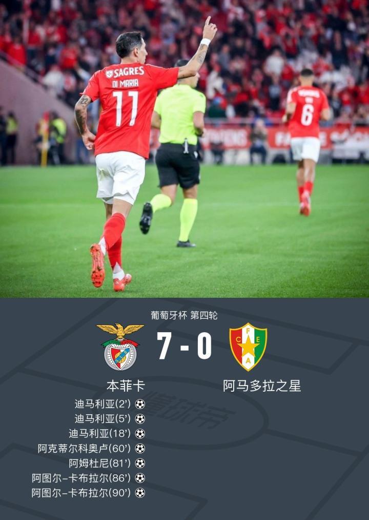 本菲卡7-0大胜阿马多拉之星,迪马利亚上演帽子戏法+助攻