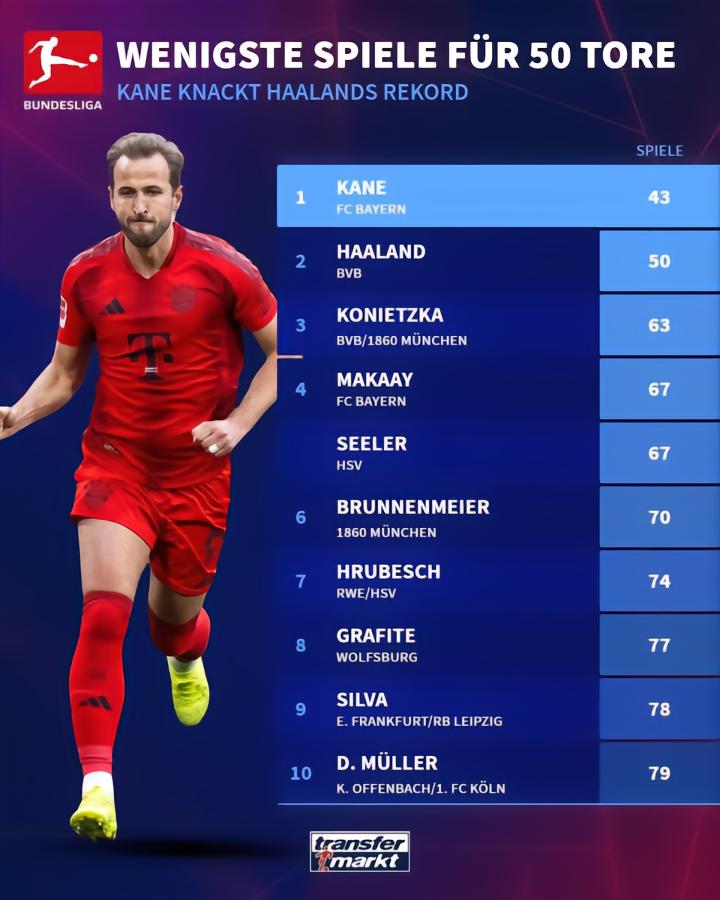 在德甲第11轮的比赛中,哈里-凯恩上演帽子戏法,帮助拜仁慕尼黑在主场3-0完胜奥格斯堡,这位英格兰球星也就此达成了德甲50球的里程碑,并且是德甲联赛历史上达成50球大关速度最快的球员。