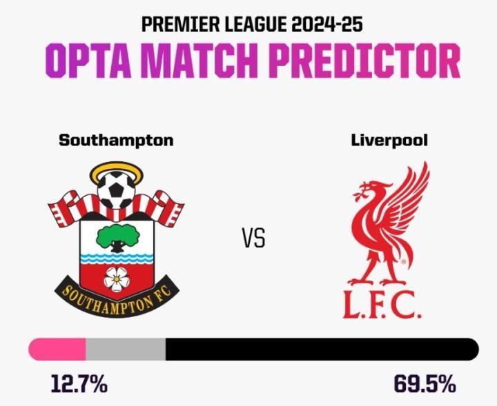 Opta的超级计算机在赛前进行10000次模拟,预测出利物浦本场赢球概率69.5%,南安普顿只有12.7%机会取胜,双方战平的可能性为17.8%。