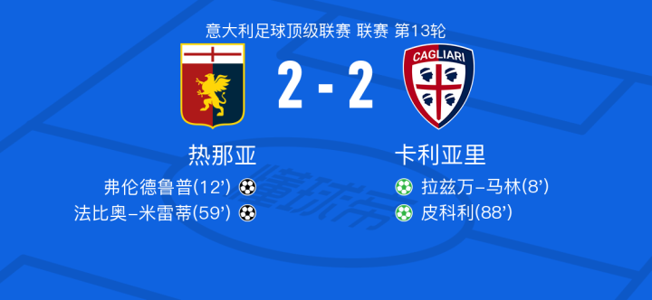 北京时间11月24日热那亚vs卡利亚里,弗伦德鲁普得到全场最高的7.9分,巴洛特利得到全场最低的5.7分