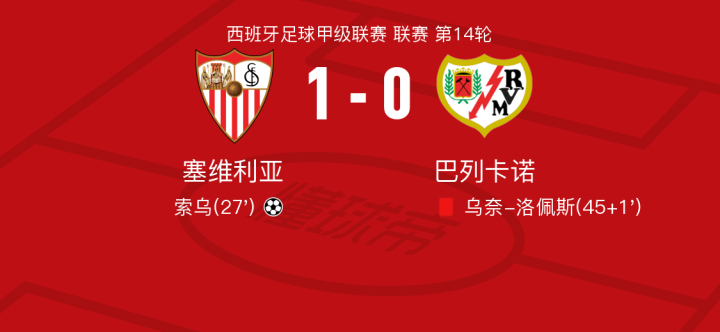 北京时间11月24日塞维利亚vs巴列卡诺,索乌得到全场最高的7.8分,乌奈-洛佩斯得到全场最低的5.6分