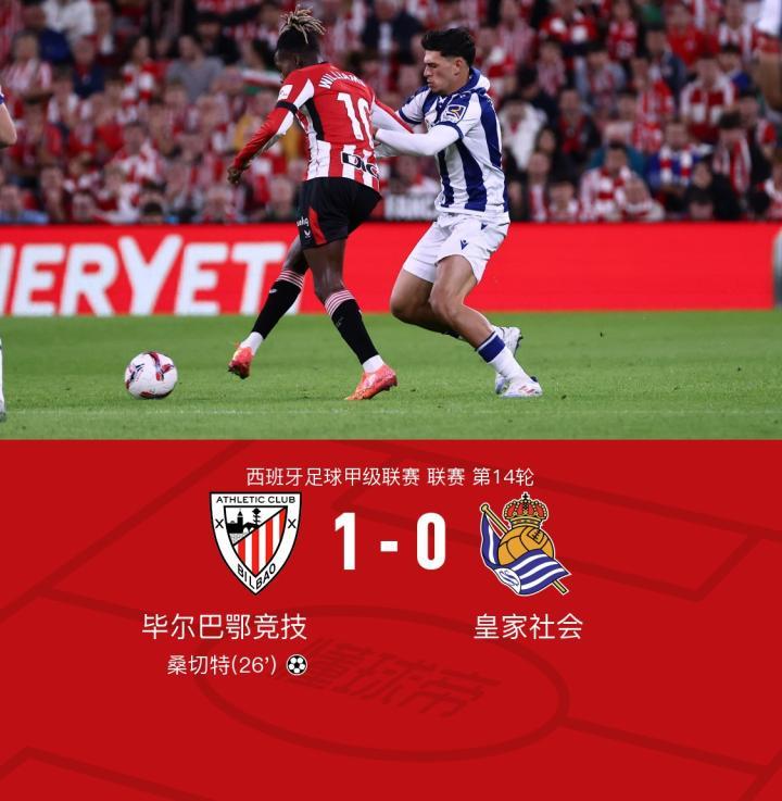 毕包1-0皇家社会,桑切特一击制胜,威廉斯献助攻