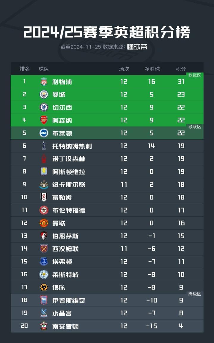 北京时间11月25日凌晨,2024/25赛季英超联赛结束了第12轮的绝大多数比赛,积分榜形势也产生了进一步的变化。