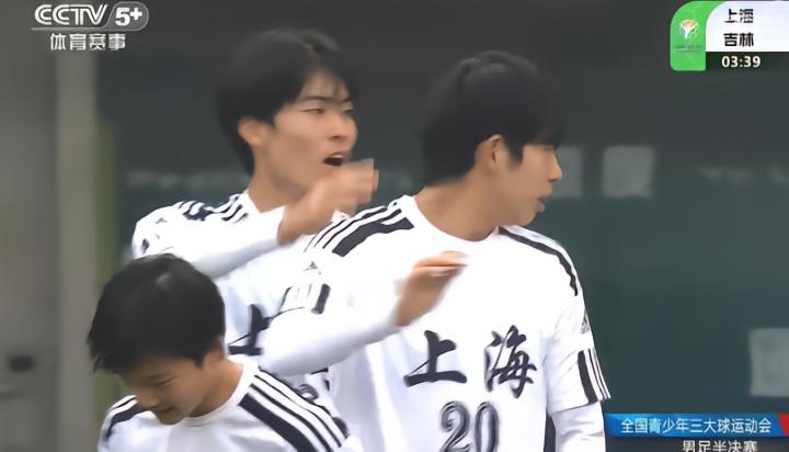 全国第一届青少年三大球运动会男足项目半决赛交锋,上海男足5-2淘汰吉林男足,上海队方面蒯纪闻和刘诚宇双双梅开二度。