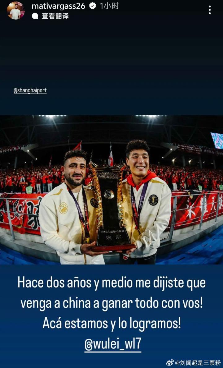 巴尔加斯在社交媒体上晒出与武磊合照,并写道:“两年半前你告诉我一起来中国赢得一切,现在我们在这里,我们做到了!”