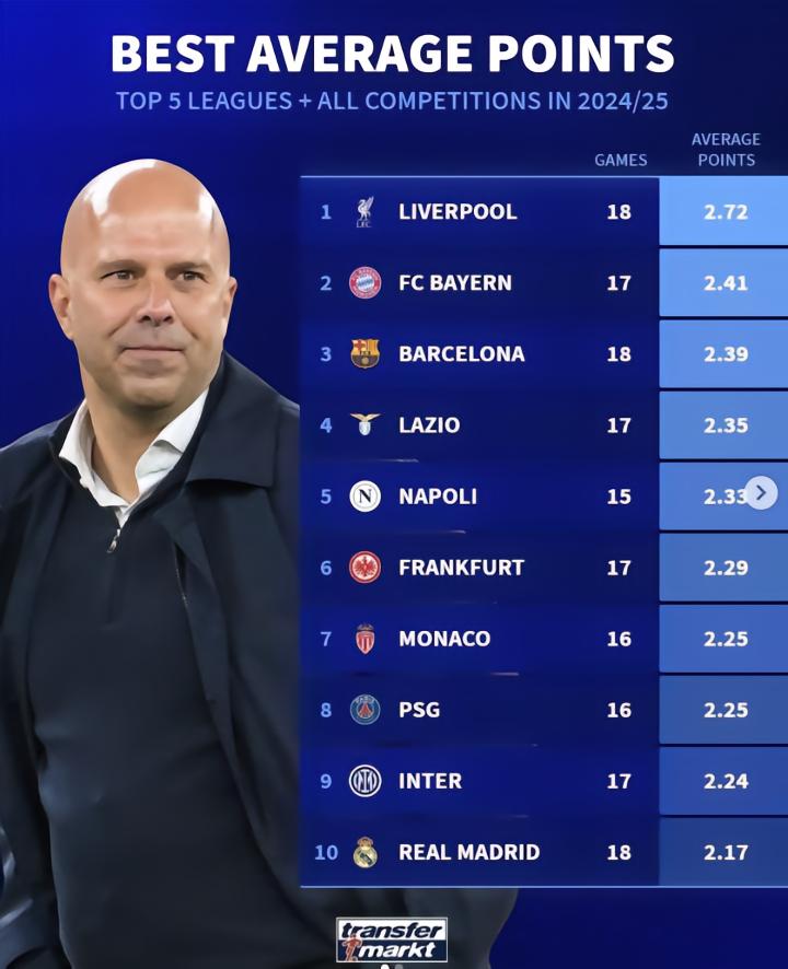 最近,德国转会市场列出了本赛季五大联赛球队的场均积分榜单,其中利物浦场均2.72分居首,拜仁、巴萨前三,国米、皇马在列。