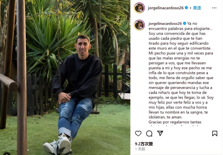 昨日,迪马利亚的妻子卡多佐在个人社媒更新了长文,行文充满对丈夫与家庭的绵绵爱意。