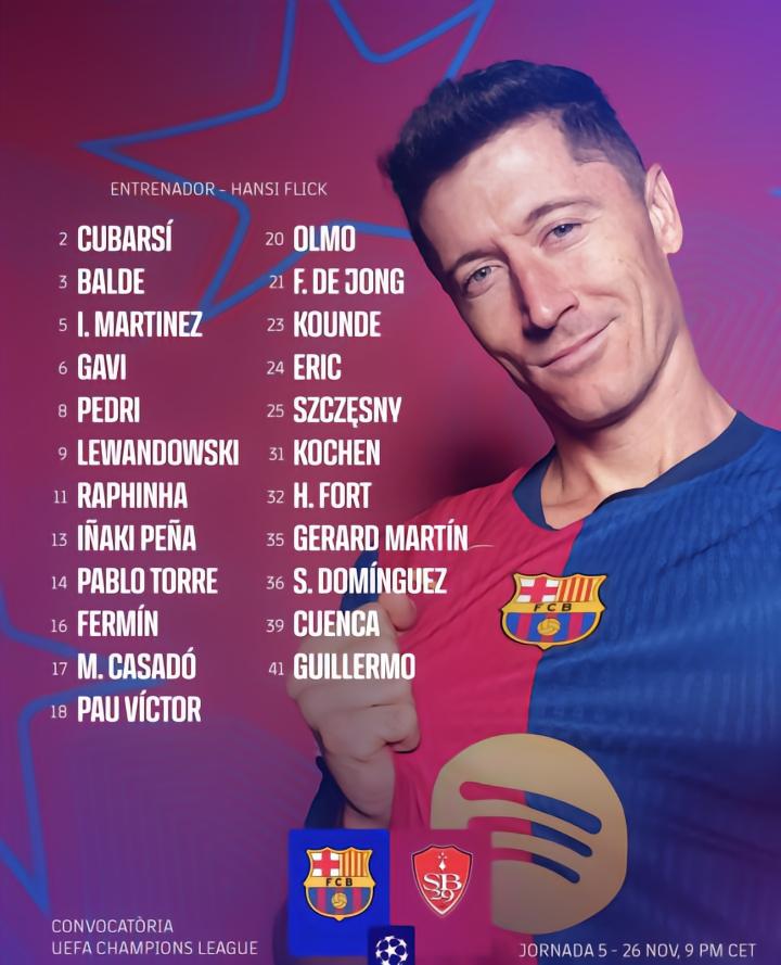 北京时间11月27日凌晨4点,欧冠联赛阶段第五轮,巴萨将在主场迎战布雷斯特。赛前,巴萨官方发布了本场比赛的大名单。