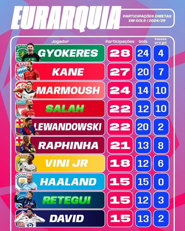 根据统计,在目前欧洲主流联赛的球队中,葡萄牙体育的哲凯赖什是直接参与进球数最多的球员,他在自己出战的19场比赛中打进24球并送出4次助攻。拜仁慕尼黑的哈里-凯恩在这份榜单上排名第二,法兰克福的马尔穆什排名第三。
