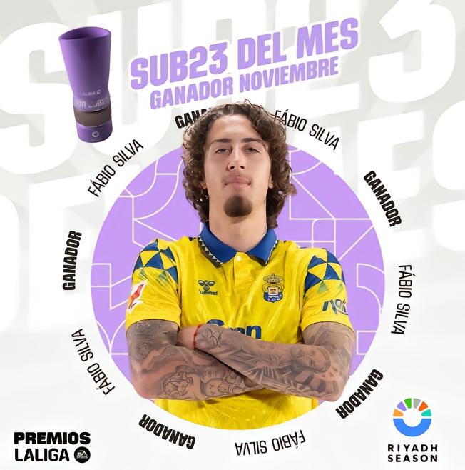 法比奥-席尔瓦被评选为西甲11月最佳U23球员,这一奖项由西甲与利雅得赛季共同颁发,这位年轻的前锋是拉斯帕尔马斯的关键人物,本月他的出色表现得到了认可,共打入两粒进球。