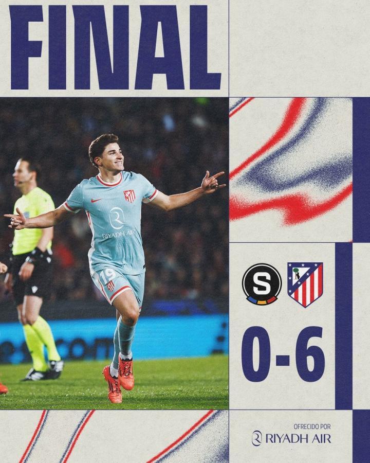 此役客场对阵布拉格斯巴达,马竞凭借阿尔瓦雷斯和安赫尔-科雷亚分别上演梅开二度,马科斯-略伦特、格列兹曼各入一球,6-0大胜对手。