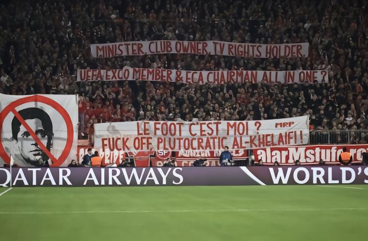 这些横幅上写着“部长、俱乐部老板、电视转播权持有者、前欧足联和欧洲俱乐部协会成员,这些角色你全都兼任?”以及“足球是属于我们的?滚蛋,纳赛尔,贪权的富豪!”